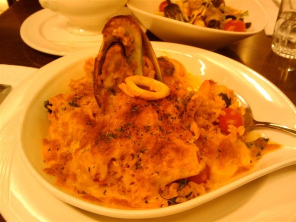 我點服務生介紹的西班牙總匯海鮮烤飯,有點像焗烤飯